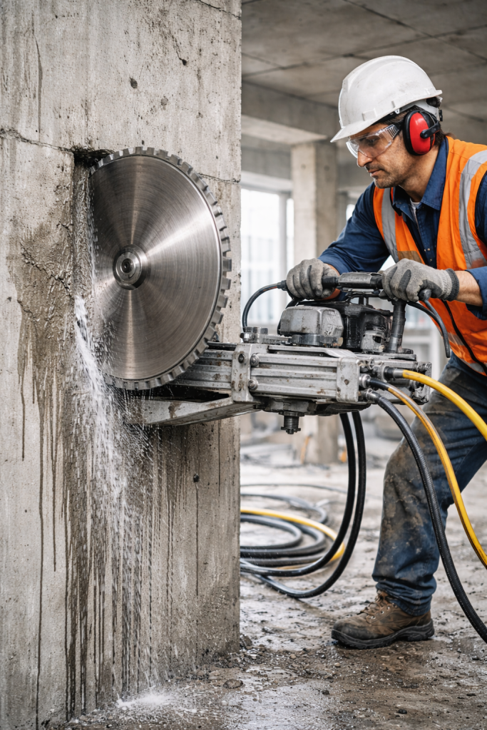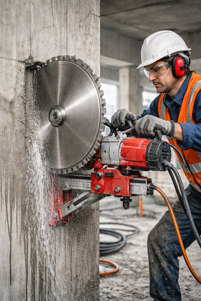 Kalın ve dayanıklı beton yüzeylerde, kontrollü ve net hatlarla profesyonel kesim sağlanır.