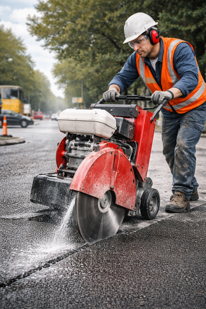 Yol ve zeminlerde çatlak kontrolü ve altyapı çalışmaları için düzgün ve kontrollü asfalt kesimi yapılır.